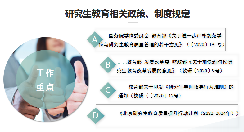 李敬强副院长传达了上级有关研究生指导教师及论文质量相关文件精神。根据近年来教育部等部门陆续出台的《深化新时代教育评价改革总体方案》、《关于加快新时代研究生教育改革发展的意见》、《关于进一步严格规范学位与研究生教育质量管理的若干意见》、《研究生导师指导行为准则》,以及北京市《关于推进新时代北京研究生教育改革发展的实施意见》和《北京研究生教育质量提升行动计划(2022-2024年)》等一系列文件,李敬强副院长明确提出培养单位的管理责任和导师的质量管控责任,强调学位论文质量控制对学校发展、学位点评估、导师选聘、学生自身成长的重要意义,指出学位论文质量控制工作被列为研究生院2022年重点工作。