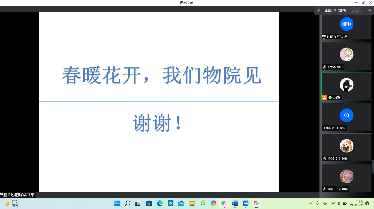 赵御彤老师从2022年春季学期师生返校安排、挑战杯比赛、素质积分、计算机考试、公费医疗、体温打卡和线上课出勤这七大方面向大家做出了简要的说明,为大家近期所出现的问题进行了详细的解释,并提醒大家按时进行每日健康打卡,做好疫情防控。期待与大家的再次相见。