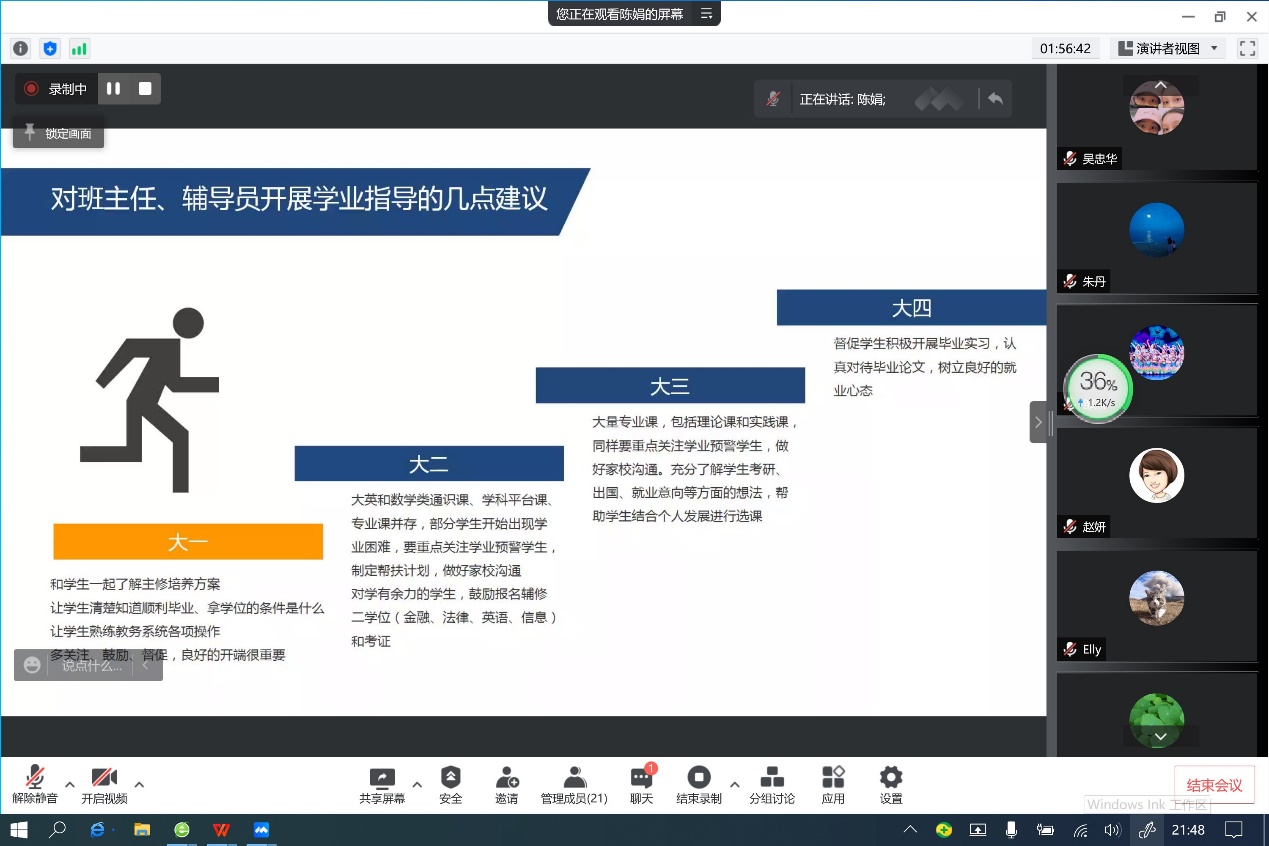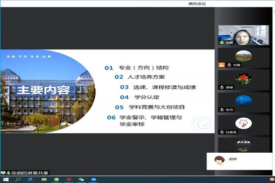 于2022年4月14日晚20:00成功举办了班主任、辅导员学业问题专题培训会。培训会由学院陈娟副院长主讲,学院领导班子成员、全体班主任以及辅导员参会,会议由辅导员刘娜老师主持。