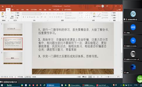 为提高同学们的学习效率,此次班会特意邀请班级里的学霸易丽榕、邓沛雯、李怡霄三位同学对自己的学习经验进行了分享。三位同学详细讲解了自己的学习方法,分享了自己的学习体会。易丽榕认为,形成课前预习、课上认真听讲、课后记笔记、课下做练习巩固等一套系统的学习流程比较重要;邓沛雯认为,学习要有针对性,由易到难、由小及大、循序渐进逐步提升很关键;李怡霄认为,模拟在学校教室里学习的状态,梳理理想目标,因时因地,制定一份详细的宅家学习计划很有意义。三位同学的经验给其他同学以很大启发,大家纷纷表示,要向她们学习好的经验,并找到适合自己的学习方法,让自己的线上学习更有效率,提高学习成绩。