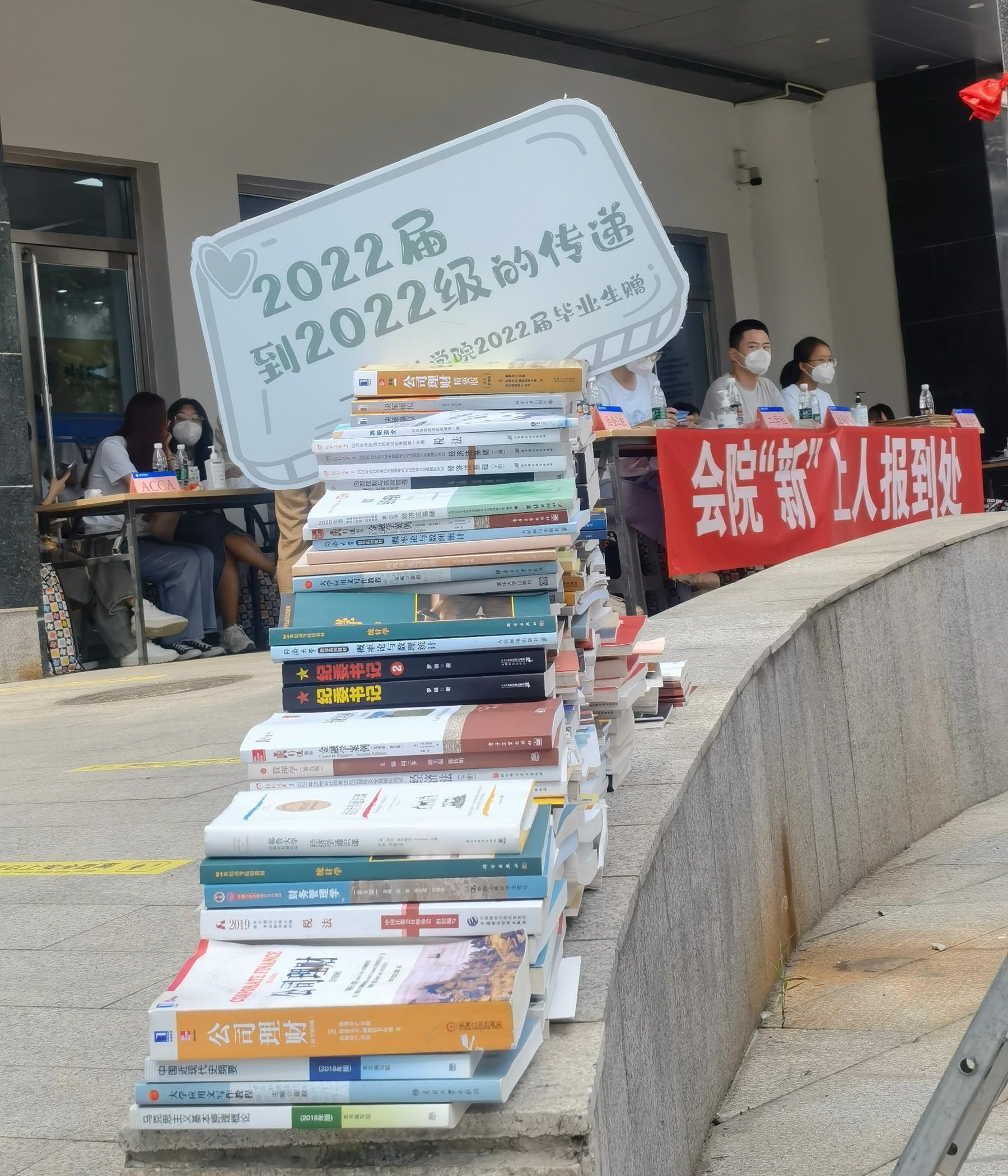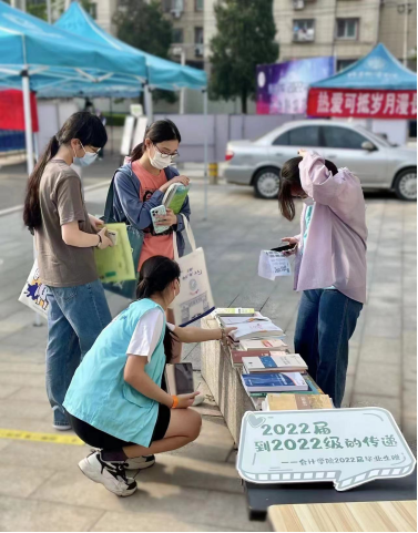 7月份刚毕业的2022届学子们。毕业生们在离校时把一些学弟学妹们可以继续阅读的书籍和使用的物品捐赠给学院的学弟学妹;老师们在帮助学生打包行李时也将学生带不走的书籍和学习用品整理出来留存好,在9月份开学时送给来报到的新生,将绿色低碳理念和会院学子追求知识的精神传承下来。