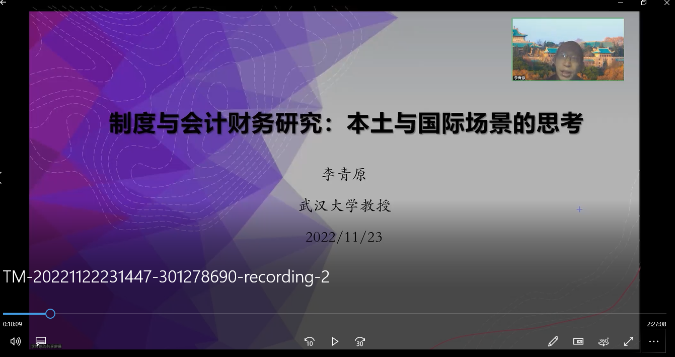 邀请,为学院师生做了题为“制度与会计财务研究:本土与国际场景的思考”的学术讲座。讲座采用线上方式进行,共有40余位教师与学生聆听了讲座。讲座由十大手机赌·博游戏大全