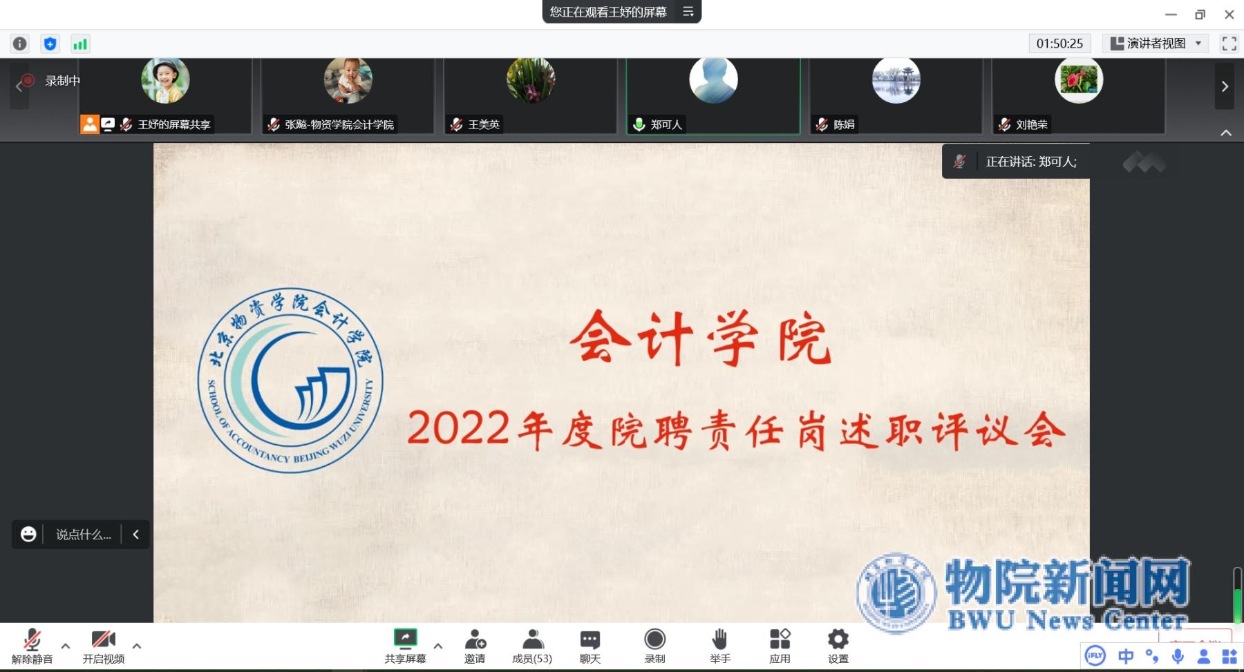 2022年绩效工资分配实施方案》院聘责任岗述职要求,会上,担任学院7个院聘责任岗位的8名教师分别围绕2022年度岗位工作情况和工作成效进行了述职,并提出了下一步工作思路。述职结束后,全体老师在线对8名老师院聘责任岗任职情况进行了测评。其他院聘责任岗位按照规定流程,由在所属的委员会进行了在线测评。