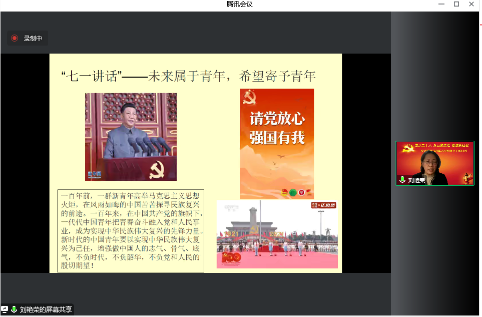 在授课中,刘艳荣书记号召同学们听党话、跟党走,积极加入党组织。从《少年中国说》到毛泽东在莫斯科大学发表演再到习近平总书记对广大青年的寄语,刘艳荣书记指出当代青年要明确时代赋予的责任,深入学习研讨,在学习基础上不断深入思考,在思考基础上坚持理想信念和追求。鼓励同学们踏实认真学习,入脑入心思考,坚持不懈追求,早日实现理想。