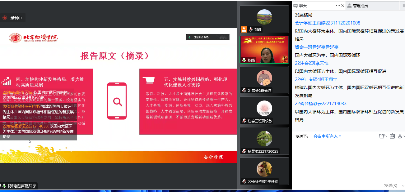 在对党的二十大报告学习中,陈娟副院长重点选取二十大报告中的新变化,强调科教兴国战略,提出互动问题:新发展理念是什么?新发展格局是什么?高质量发展是什么?同学们围绕问题在聊天区积极互动回答。同时引发同学去思考作为当代大学生,应该如何发挥自己的知识和能力,去服务于祖国的高质量发展。