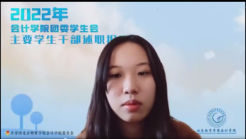 学生会一定会继续坚定理想与信念,再接再厉,将学生会打造成团结一心、和谐进步的服务型团队,牢记全心全意为同学服务的精神。轮值主席孟令冉从自己负责的四个部门出发进行总结,提到了各类宣传活动及志愿活动的圆满完成,表示未来一年我们会继续立足于同学、服务于同学的宗旨精进学生会内部与学院建设,积极开展工作。