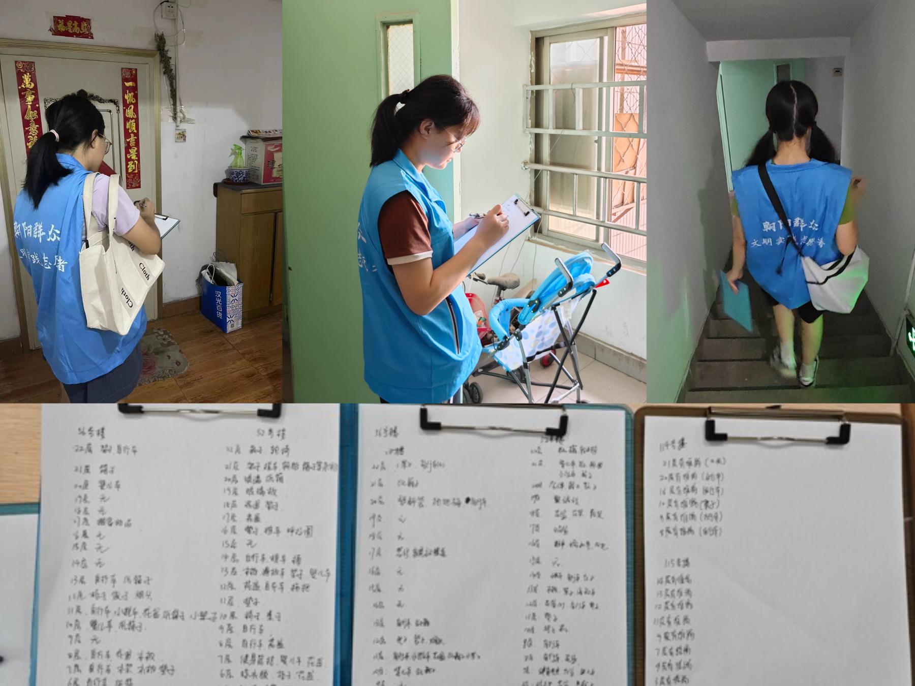 学生第四支部党员师生和22智能会计团支部部分团员走进南新园西社区的各个楼宇中,从1层到24层逐楼逐层查看居民楼道和阳台物料堆放情况,及时记录各个楼层物料堆放情况。针对存在物料堆放情况的楼层,师生们敲门到户逐一与住户询问交流,提醒住户清理楼道堆放物,畅通生命通道。
