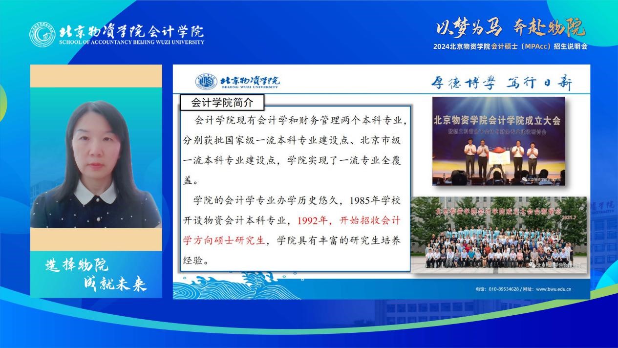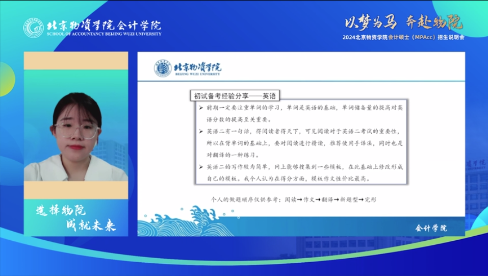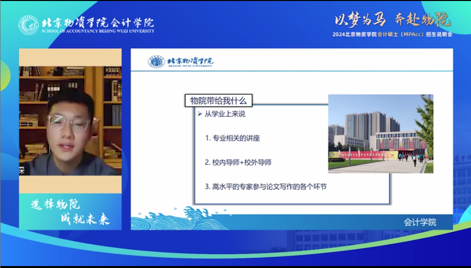 副院长王美英教授、2023级会计专硕研究生李九妍、 2021级会计专硕研究生田谷琛分享了北京物资学院会计专硕项目与学习体验,说明会由2023级会计专硕研究生宋洋主持。