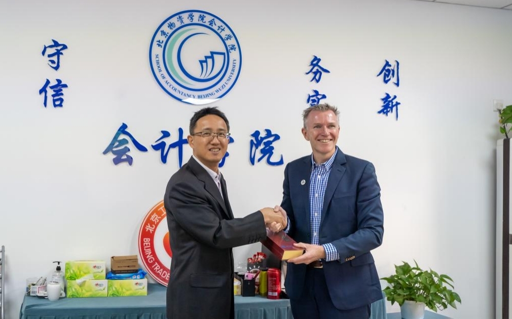 会谈结束后,卢向红副院长与Prof. Colin Higgins院长分别代表北京物资学院与迪肯大学互赠礼品,并表示会后就会谈达成的共识,积极有效地推进后续合作。