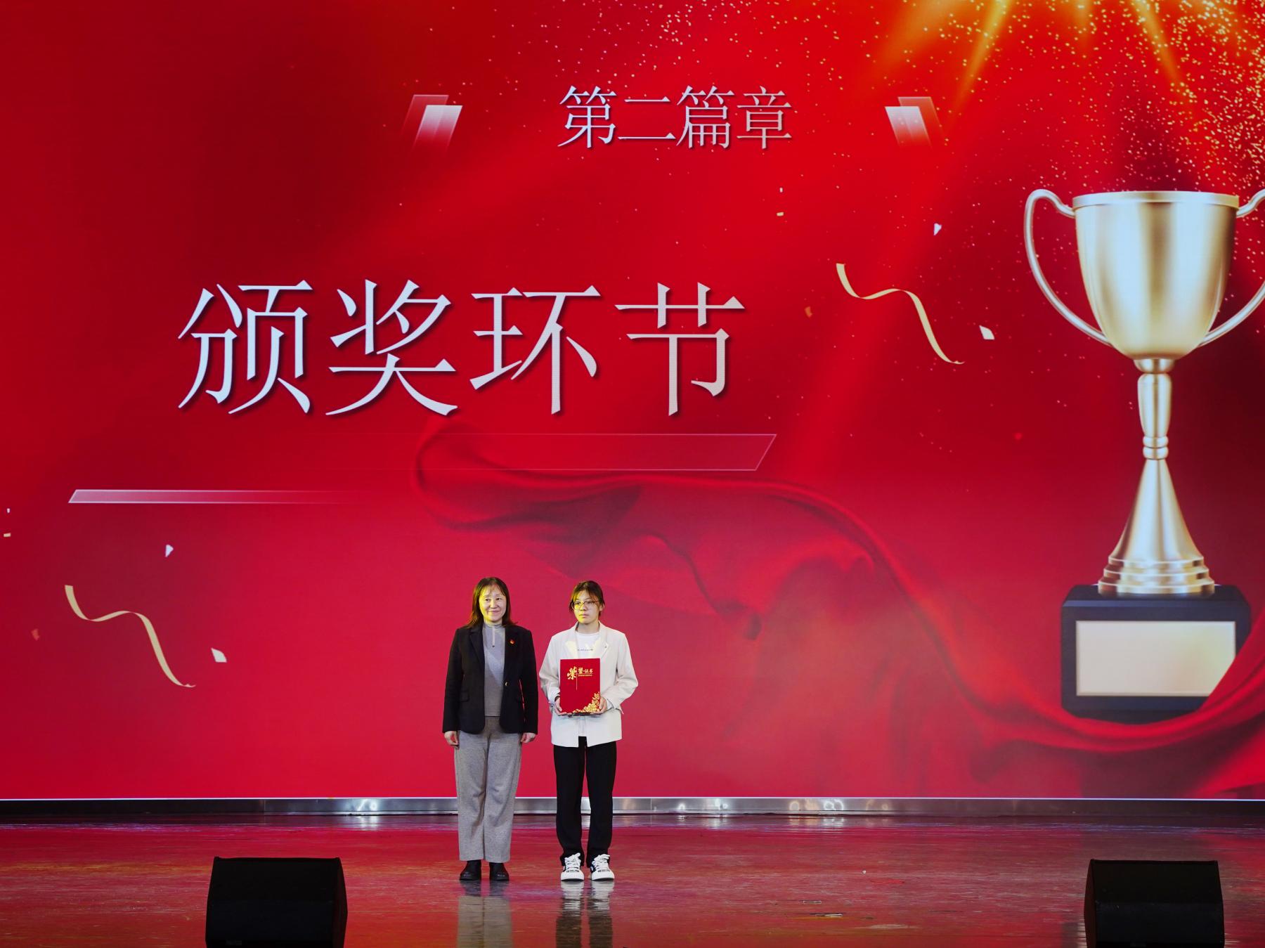 在颁奖环节中,由校党委学生会工作部(学生处)部长庞波为国家奖学金、国家励志奖学金获奖学生代表颁奖。
