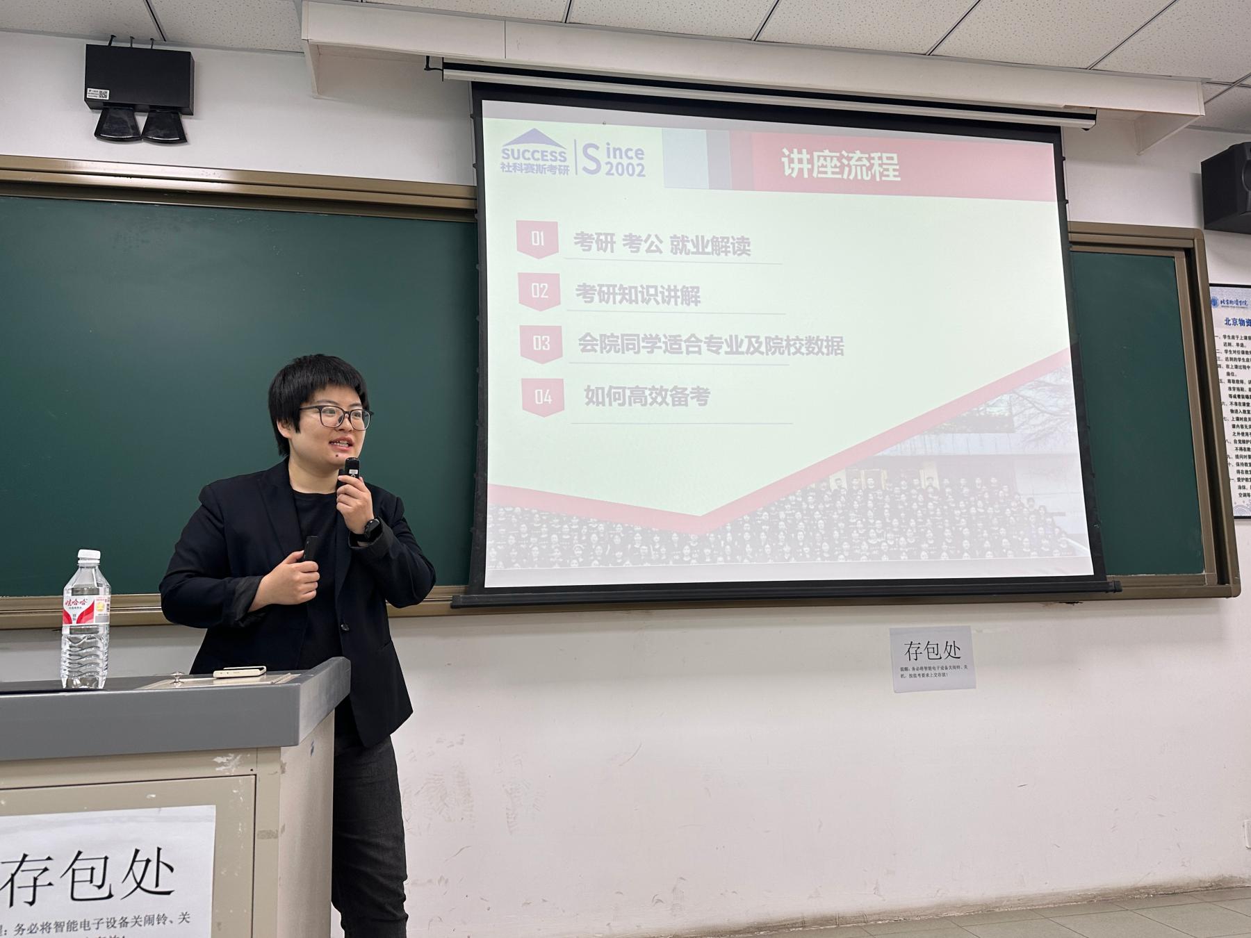 学生第四党支部书记王鹏莉对北京社科赛斯教育科技有限公司北京分校校长吴朋倩和学生潘子菲、郭雨欣的精彩分享表示感谢,对学生们提出了三点希望:一是找准赛道,顺势而为。王老师指出,当前就业竞争激烈,建议学生们要以自身的知识和能力为基础,结合职业规划和实际情况科学选择,找准就业赛道;二是重点发力,抢占先机。围绕意向岗位需求,早规划、早准备、早出击,充分利用学校学院提供的各类资源平台,锻造过硬的专业素养和职业能力;三是稳扎稳打,静待花开。考研不仅是知识的博弈,更是心态的较量。她鼓励学生们要调整好自己的状态,以平稳积极的心态面对备考路上的困难和挑战,脚踏实地,持续深耕,等一季花开。