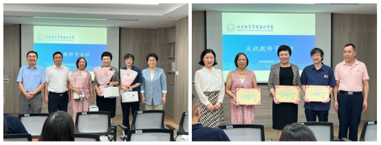 于海蛟副院长向全体教师送上节日的祝福,也向三位退休老师送上了美好的祝愿,他讲到,高校教师是一个令人羡慕的职业,学校也是一个充满爱和温暖的地方,能够在学校工作很幸福。于海蛟副院长向老师们介绍了学校食堂的改建和将要开工建设的后勤服务综合楼,并表示努力为学校和学院的发展多做实事,做好后勤服务和保障工作。离退休工作处处长申云贵向三位退休老师颁发了光荣退休证书,希望退休老师在人生的新阶段“启航新征程,扬帆再出发”,继续为教育事业做出新贡献。