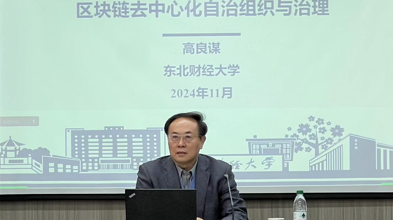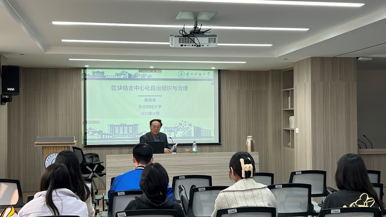 在科研楼300会议室成功举办了题为“区块链技术、去中心化组织与治理”的专题讲座。本次讲座由东北财经大学著名教授、博士生导师高良谋主讲,30余位师生参与了交流,张军院长主持了讲座。