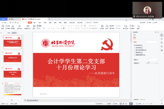 为进一步深化学生爱国主义精神、提升思想道德素质,养成正确的世界观、人生观、价值观,会计学专业学生第二党支部于10月28日在腾讯会议平台开展十月份的党课学习,会议由支委纪鹤洋主持,支部书记和全体党员参与。
