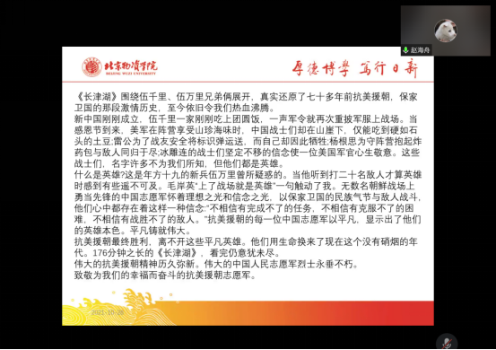首先是支部赵海舟同学进行分享,其次是纪鹤洋同学,两位同学的感想中都描述了一些自己印象比较深的电影镜头,感叹我们现在的辛福生活来之不易,无数英雄前辈们用自身性命换来了如今的和平年代,我们应铭记历史,不忘初心,努力提升自己,争取日后为国家作出更大贡献。