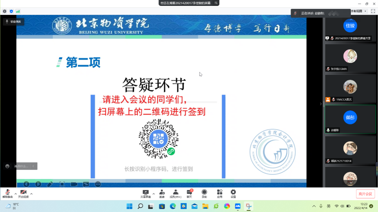 答疑环节中,同学们对于素质积分获得和素质培养方案的内容不清楚的地方向赵老师提出,由赵老师进行答疑。