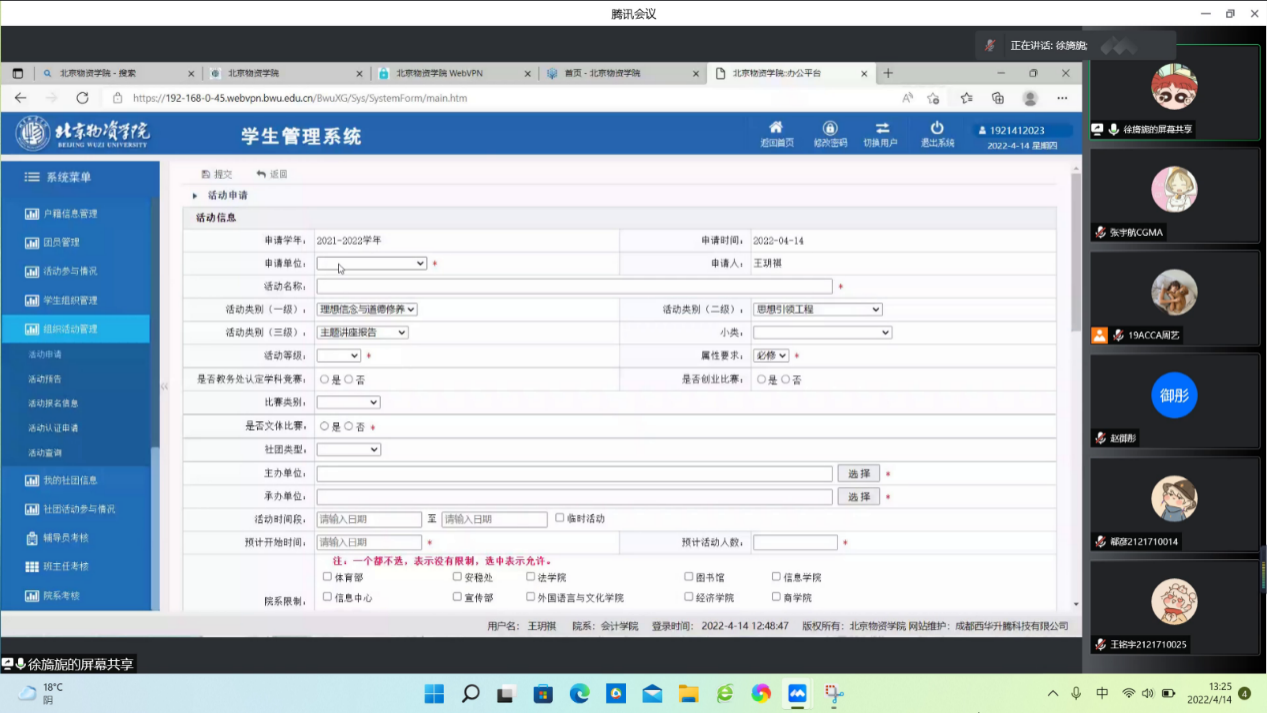 最后,由徐旖旎同学进行立项流程演示。徐同学从立项申请,到详细内容填写,再到最后的名单录入进行了详细的讲解,并对其中的重要内容进行了强调说明。