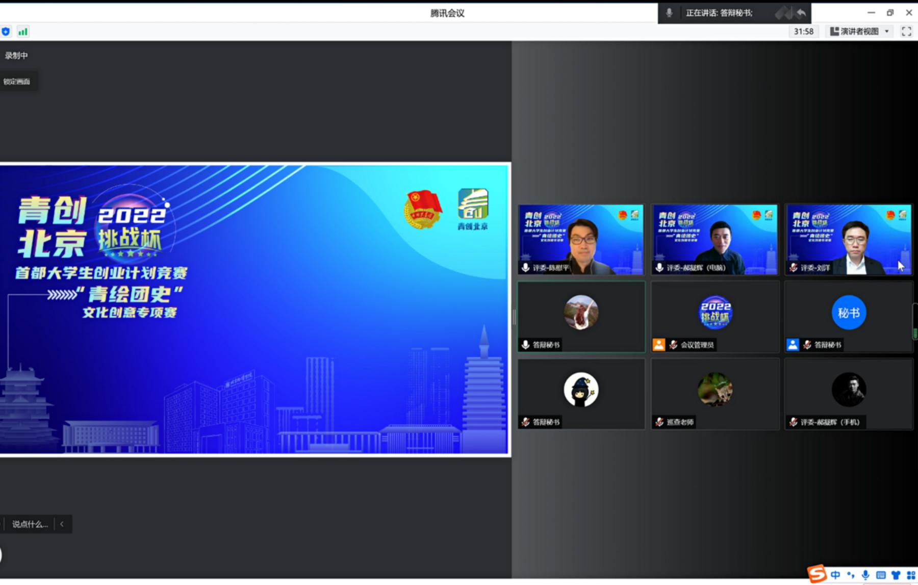 历时近5个小时,进入决赛的23支队伍全部展示完毕,“青创北京”2022年“挑战杯”首都大学生创业计划竞赛“青绘团史”文化创意专项赛决赛答辩圆满成功。所有材料提交给团市委进行最后的核准以及结果的公布。